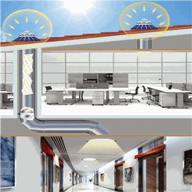 白天模式:无电照明系统是由室外的钻石型采光器,通过光线的折射、透射、聚焦等原理高效地收集四面八方的太阳光和自然光,然后通过光线传输区的导光管对收集来的光线做高效反射处理,把光线直接反射、传输到室内,最后由室内的漫射器将采集来的光线打散,使其能够更加均匀柔和地扩散到室内的每个角落。